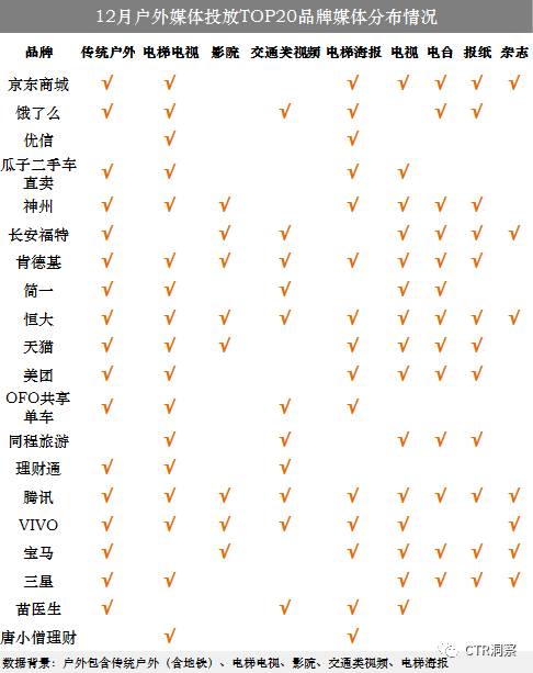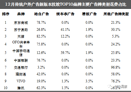 以京东为例,其传统户外广告新版本投放花费位列TOP20榜单首位,并分别推出了“12.12 京东服饰家居年终盛宴”、“上微信趣京东”和“京东年货节” 三个传统户外广告新版本。以下将以干货的形式盘点各大明星企业户外投放的最新动向。