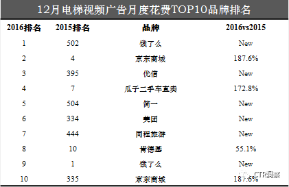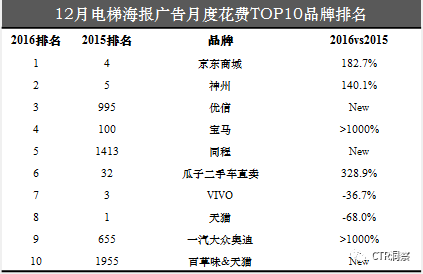 央视市场研究(CTR)最新数据显示,就在刚刚过去的2016年12月份,京东、天猫、苏宁等电商纷纷开启年底狂欢模式,在户外广告投放上频频发力。