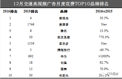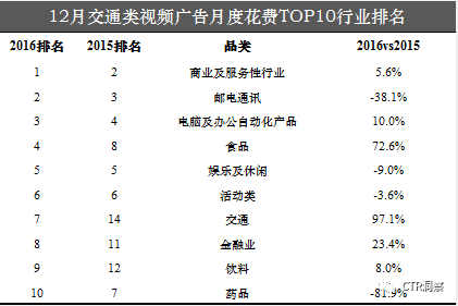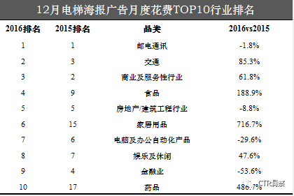 12月,传统户外广告花费同比整体攀升,邮电通讯行业蝉联头名,而电脑及办公自动化产品则以93.8%的同比涨幅吸引了足够关注。