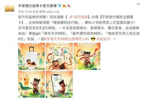通过对IP原生形象的再设计,平安银行信用卡将哪吒形象与银行产品进行融合,推出平安银行哪吒主题套卡,信用卡与借记卡一次申请双卡齐开。