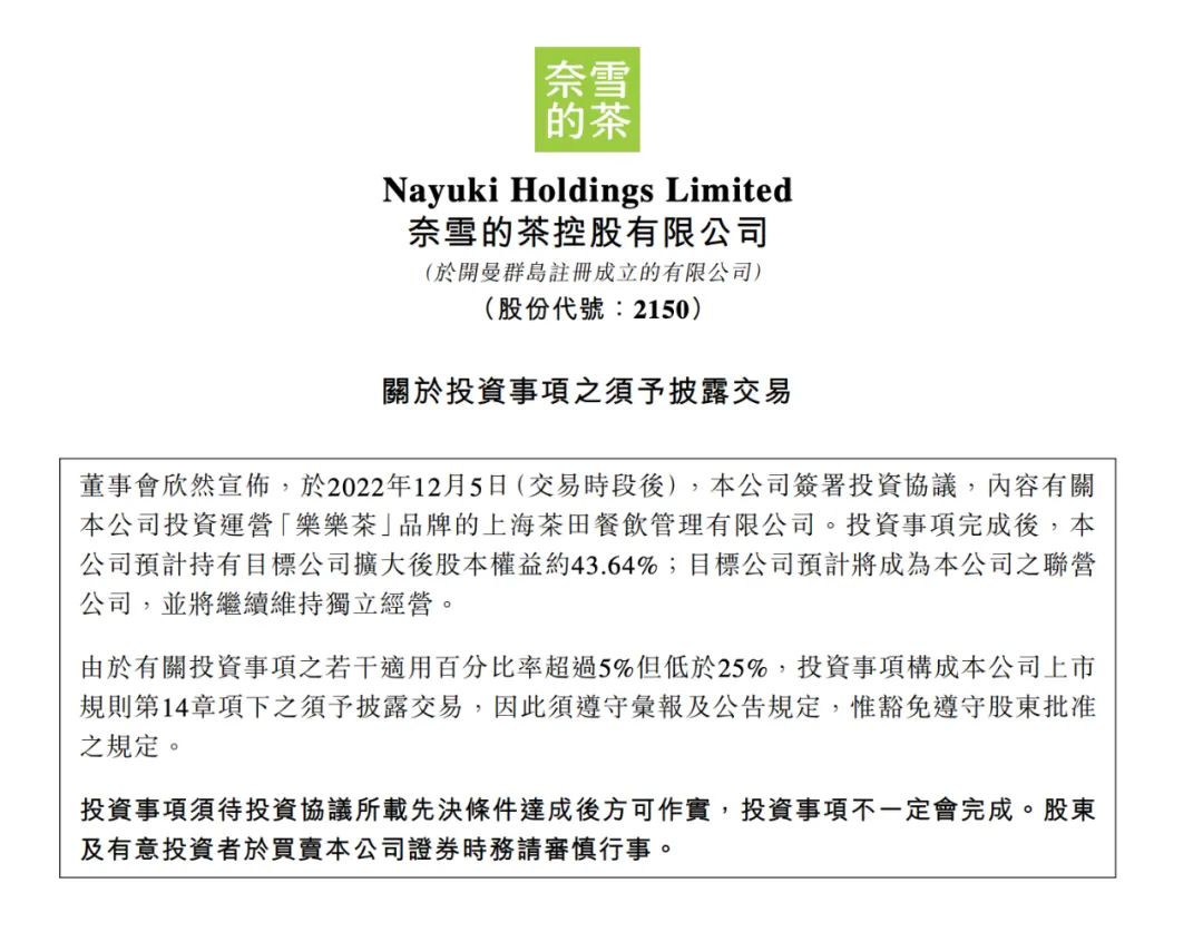 奈雪的茶控股有限公司于12月5日晚间发布公告称,其已签署对乐乐茶主体公司上海茶田餐饮管理有限公司的投资协议。投资事项完成后,奈雪的茶将持有目标公司43.64%股本权益,即,奈雪将成为乐乐茶第一大股东。