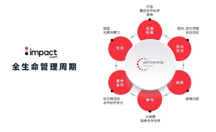 品牌可以通过专业的合作伙伴营销管理SaaS平台,如impact.com,对多类型的合作伙伴营销项目全流程开展精细化的管理,包含从合作伙伴筛选拓展招募、合作对接沟通、签约计佣支付,到追踪营销效果、互动再开发合作伙伴、保护监控流量真实性并优化伙伴营销合作等六大流程。