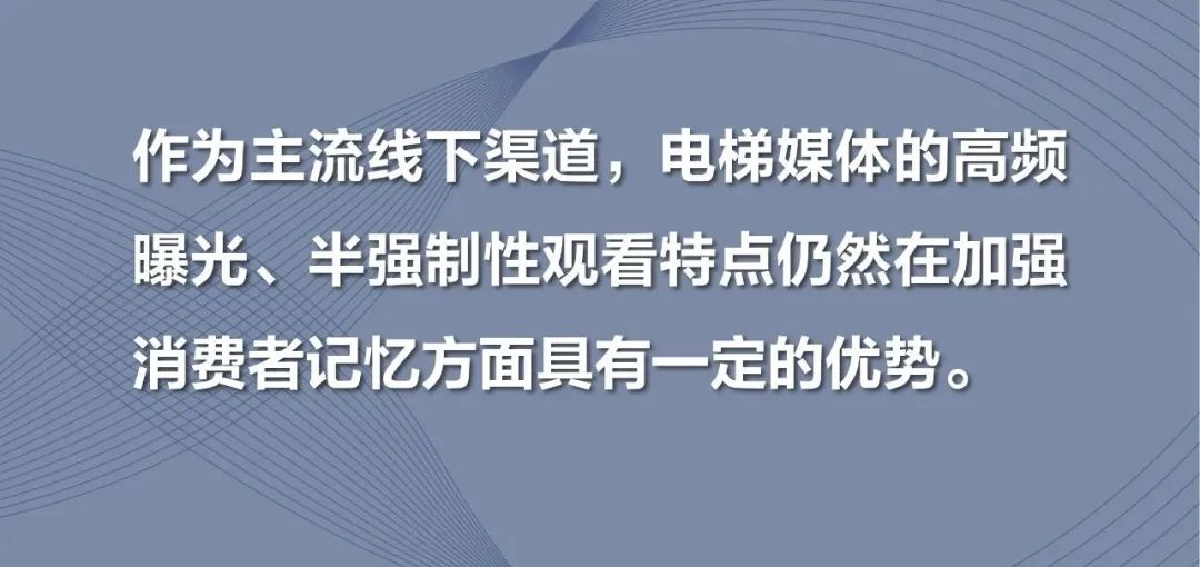 "根据益普索Ipsos《引爆记忆广告语盘点》,Top10 热门/高辨识/占据心智的广告语中,84%消费者记忆渠道源于电梯媒体,69%源于互联网媒体,50%源于电视广告。作为主流线下渠道,电梯媒体的高频曝光、半强制性观看特点,仍然在加强消费者记忆方面具有优势。"