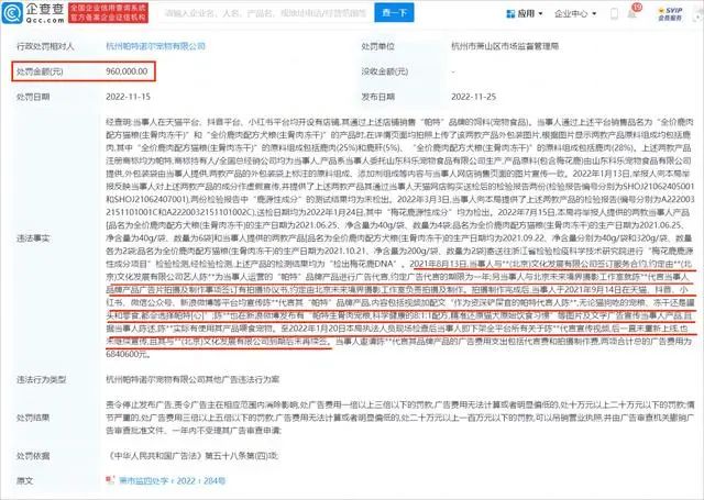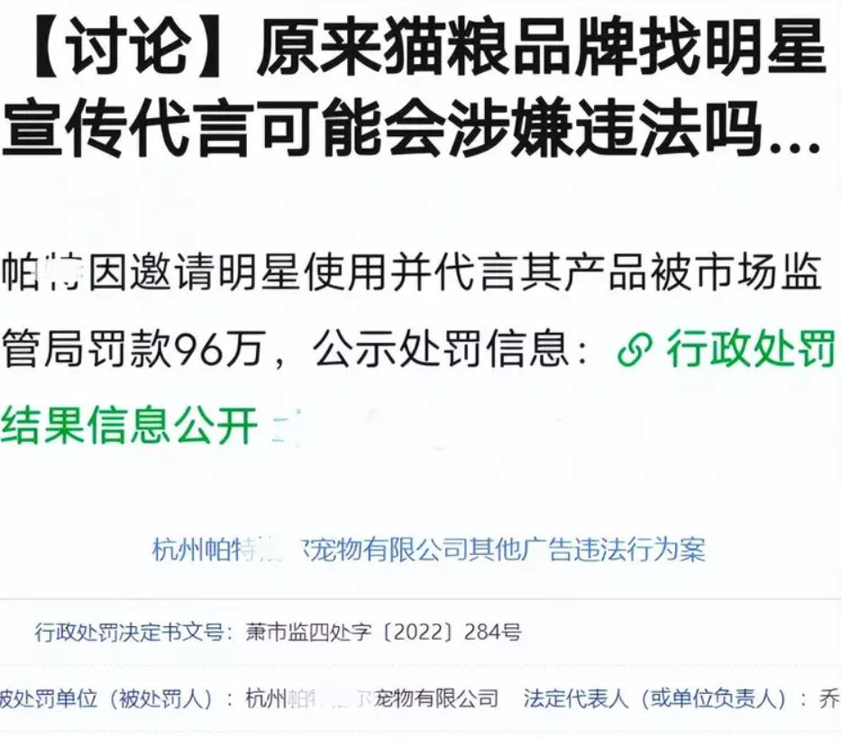 近日,帕特猫粮因邀请艺人陈伟霆代言被罚96万引发网友关注。企查查APP显示,帕特猫粮关联企业为杭州帕特诺尔宠物有限公司。11月15日,该企业曾因违反广告法第五十八条第(四)项,被杭州市萧山区市场监督管理局罚款96万元。