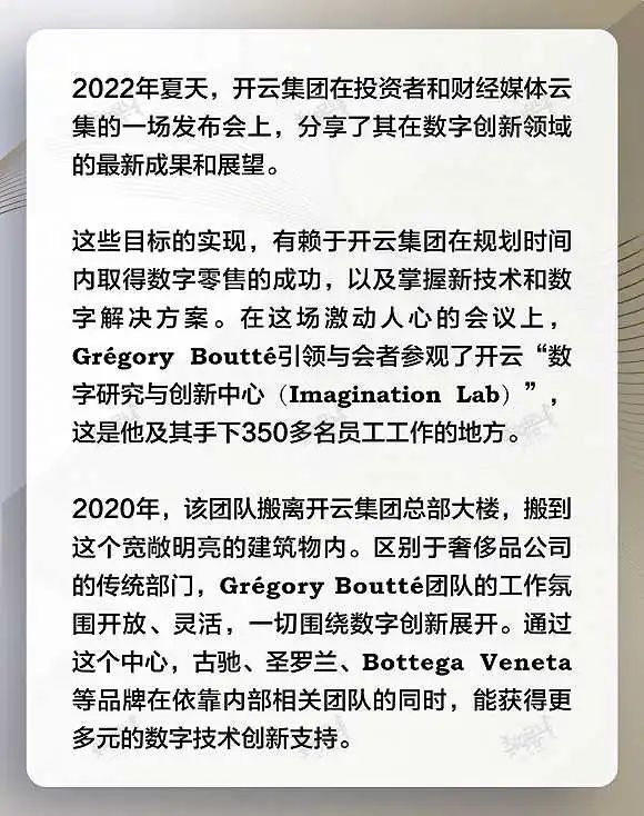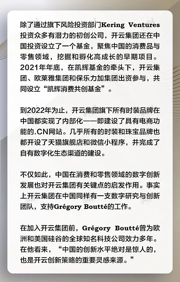 事实上,开云旗下多个品牌在过去多年,基于中国数字生态系统而率先推出的一系列数字创新举措,如今已经被推广至世界其他地方。