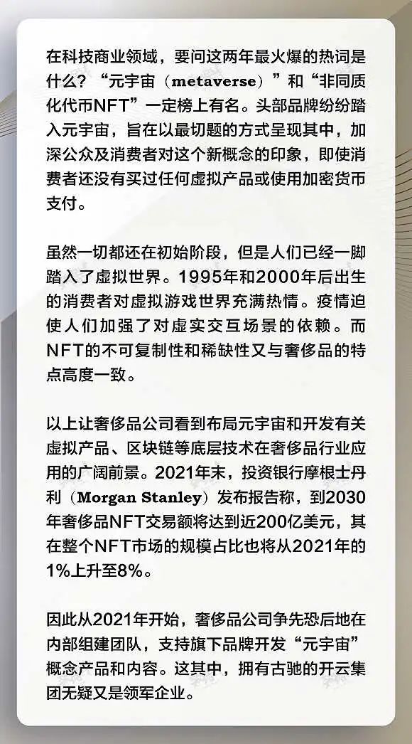 我们非常幸运,有很好的品牌,像古驰已经围绕Web3.0和元宇宙创建了团队,可以说这支团队可能是整个行业中最先进的,甚至在实现新想法和新计划方面都超越了奢侈品范畴。