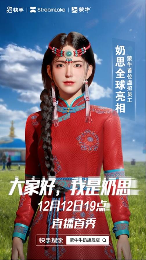据悉,凭借行业领先的全链路数字人直播解决方案,和快手作为内容平台在品牌营销上的独特优势,快手StreamLake从多家数字虚拟人领域头部企业的竞争中脱颖而出,为此次蒙牛人性化的直播电商IP打造提供技术支持。作为双方从0到1量身打造的品牌虚拟人IP,奶思不仅是蒙牛集团第一个虚拟员工,也是中国乳业第一个虚拟主播、元宇宙第一个游牧民族电商主播。奶思的推出不仅带动品牌营销玩法创新升级,也满足了用户在元宇宙浪潮下的全新消费需求。