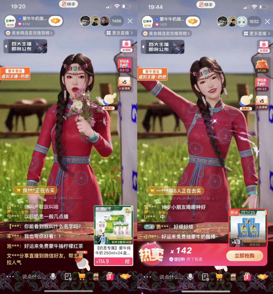 “赛白努(蒙语:大家好),我是奶思!”在双十二直播首秀中,奶思不仅展示了蒙古舞等才艺,以及虚拟人特效,还分享了牛奶生产流程等乳品知识,通过游戏互动、福利派发、带货蒙牛产品等多种方式,为直播间观众带来惊喜。目前,在快手app内搜索“蒙牛牛奶旗舰店”,便可收看本次直播的精彩内容片段。