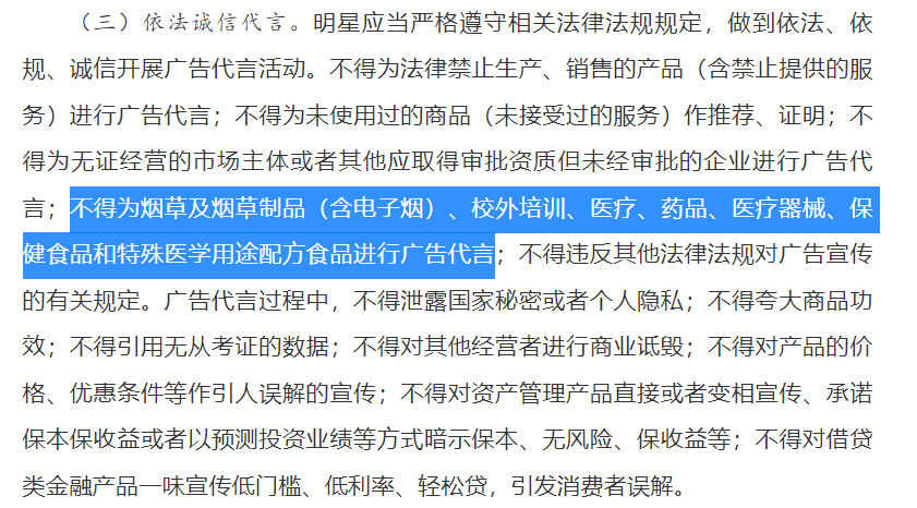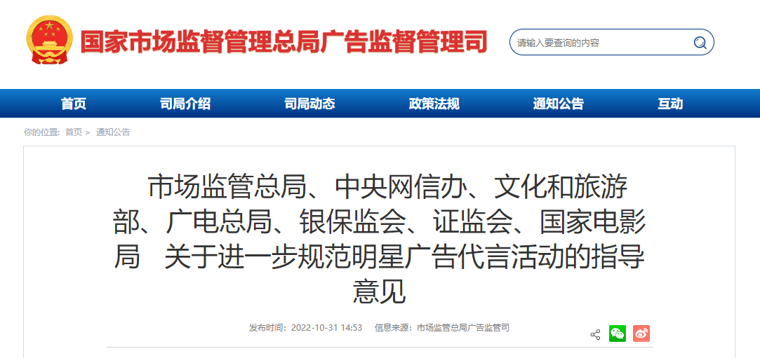 今年10月31日多部门联合发布的《关于进一步规范明星广告代言活动的指导意见》