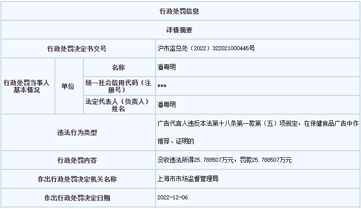 公开的《行政处罚决定书》显示,2021年3月15日,潘粤明接受委托,拍摄了日加满牌日加满饮品(绿瓶装,属保健食品,批准文号:国食健字G20041476)的60秒视频和3张平面精修图片,用于商业推广。