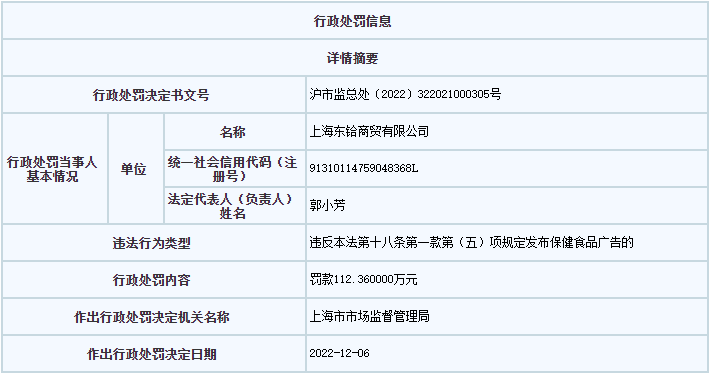 对上海东铪商贸有限公司,上海市市场监管局于12月6日作出责令当事人停止发布违法广告、在相应范围内消除影响,并处以广告费用一倍的罚款(112.36万元)的行政处罚决定。