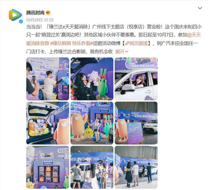 各角度的投石问路后,锋兰达更是开出联动快闪门店。独具匠心的设计一系列展览——塞满爱消除四小只的后备箱,贴满四小只的展览板…营造氛围感的同时,也强调出品牌年轻化的世界观。同时,官方推出的打卡话题赢取福利活动和达人探店的内容传播,也激发消费者走进线下店的热情,推动大量UGC内容的二次传播,完成一次有回应的营销事件。