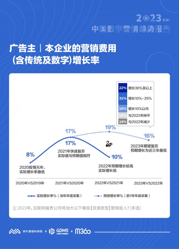 2022年社会化营销投入比去年实际增长了14%,虽然低于预期值,但社会化营销投入的增长率高于企业营销费用的增长率(2022年企业营销费用增长率是10%)。2023年社会化营销投入的预期增长率是17%,同样高于2023年企业营销费用的预期增长率(2023年企业营销费用预期增长率是16%)。
