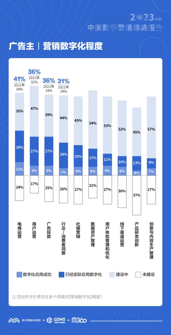 不过,不同领域的数字化程度进程差异较大,电商运营、用户运营、广告投放是营销领域中数字化应用程度最高的。并且和2021年相比,应用比例都有所提升。产品创新、内容管理、线下渠道运营的数字化程度相对较低。