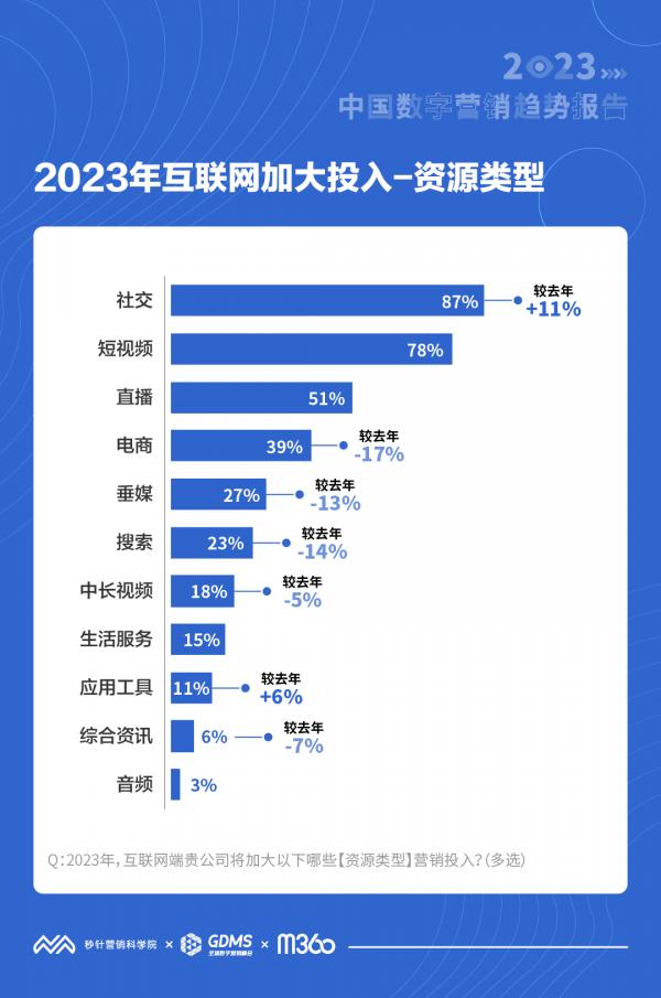 2023年的营销市场会发生什么变化?12月20日,秒针营销科学院联合GDMS、媒介360共同发布的《2023年中国数字营销趋势报告》显示,社会化营销投资引领2023年中国营销投入:移动互联网的增投比例最高,77%的广告主将增加移动互联网营销投入;互联网端增投资源类型,主要体现在社交、短视频、直播;社会化营销费用预期高于整体投资水平,社会化营销费用预期增长17%。