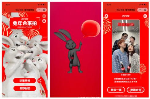 在农历新年的传统中,很多家庭会在春节时拍一次全家福合照。然而随着时代变迁,家庭成员常常很难齐聚一堂,当家人分别居住在不同城市时,合照便成了难题,照片也往往无法捕捉春节的欢乐气氛。为此,可口可乐品牌打造全新线上团聚互动体验“兔年合家拍”,让家庭成员无论身在何处,都能享受节日的团聚并珍藏美好时刻。家庭成员只需打开相机,在互动小程序人工智能面部识别技术的加持下,虚拟兔子家族便会为参与者提供指引,帮助他们以有趣新颖的方式创造独特的全家福 “合照”。全家福完成后用户可以一键分享,与那些在农历新年期间无法团聚的亲友共贺新春。