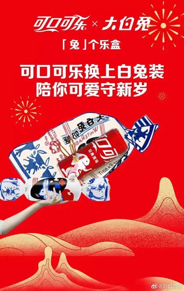 最近,这只兔子还“瞄”上了可乐——2013年1月10日,大白兔和可口可乐联名推出“兔个乐”新年礼盒,红色可乐罐穿上了白色糖衣,罐中是一颗颗大白兔奶糖,另外还有联名系列冰箱贴、靠枕、毯子等周边产品。