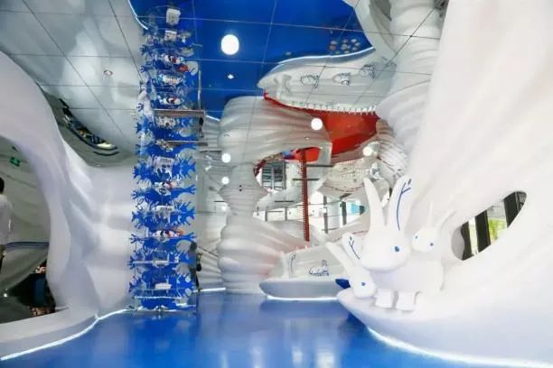 这家线下主体店的内部设计,沿用了大白兔奶糖的经典配色,湛蓝色地面、乳白色墙壁相互映衬,抬头可见天花板装饰着镜子,充满了童话感和艺术氛围。嵌入在乳白色墙壁中的货架上,陈列着大白兔新品、联名文创、跨界衍生品。