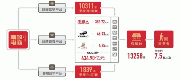 有公开数据显示,截至2021年上半年,南极电商全品牌授权经销商7943家,授权供应商1730家,授权店铺9859家,当时全平台的购买人次约为2.65亿。