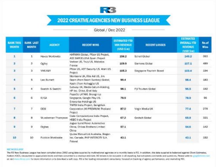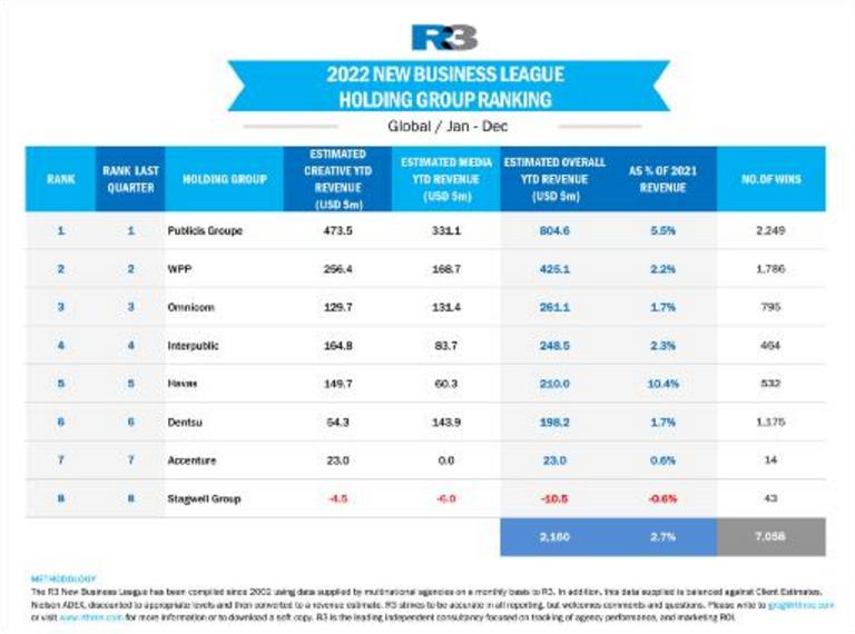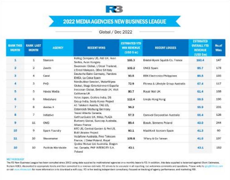2月2023–2022年是法国控股公司大步迈进的一年,阳狮集团(Publicis Groupe)和汉威士集团(Havas Group)在胜三出版的年度新业务动向报告中分别领先不同业务单元。阳狮集团是当之无愧的年度控股公司,共计赢得2,249个新业务/客户,营收增加8.04亿美元,几乎是排名第二的WPP新业务增幅的两倍。该控股集团的旗下的主要媒体代理商星传媒体(Starcom)也在媒体代理商排名中名列第一,创造了1.65亿美元的收入,高于排名第二的姊妹机构实力媒体(Zenith)60%。在创意代理商新业务变动中,法国企业汉威士(Havas)在363家公司中以1.56亿美元的总新业务收入领先于其他。