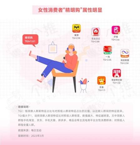 另一方面,女性消费者在消费上也并非"大手大脚"。每日互动大数据显示,女性消费者的"精明购"标签TGI值达1.61,她们偏好使用"蜜源""花生日记""好省""一淘""淘宝联盟""淘宝特价版""京喜"等APP购买特价商品,寻求返利,在"后疫情时代",女性的消费态度更加理性。因此品牌在和女性消费者沟通时,不仅要做好情感营销,还要更加注重产品卖点、功能优势、折扣赠品等方面的包装呈现。