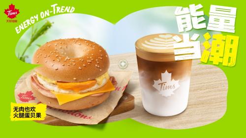 植物基的应用不仅是咖啡饮品层面的创新,Tims天好咖啡的贝果产品也应用了“植物肉”,进一步做出“减负”适配,推出“无肉也欢火腿鸡蛋贝果”。高蛋白质植物肉火腿,搭配流心荷包蛋和芝士,美味不减,却更健康,真正实现“无肉也欢”。