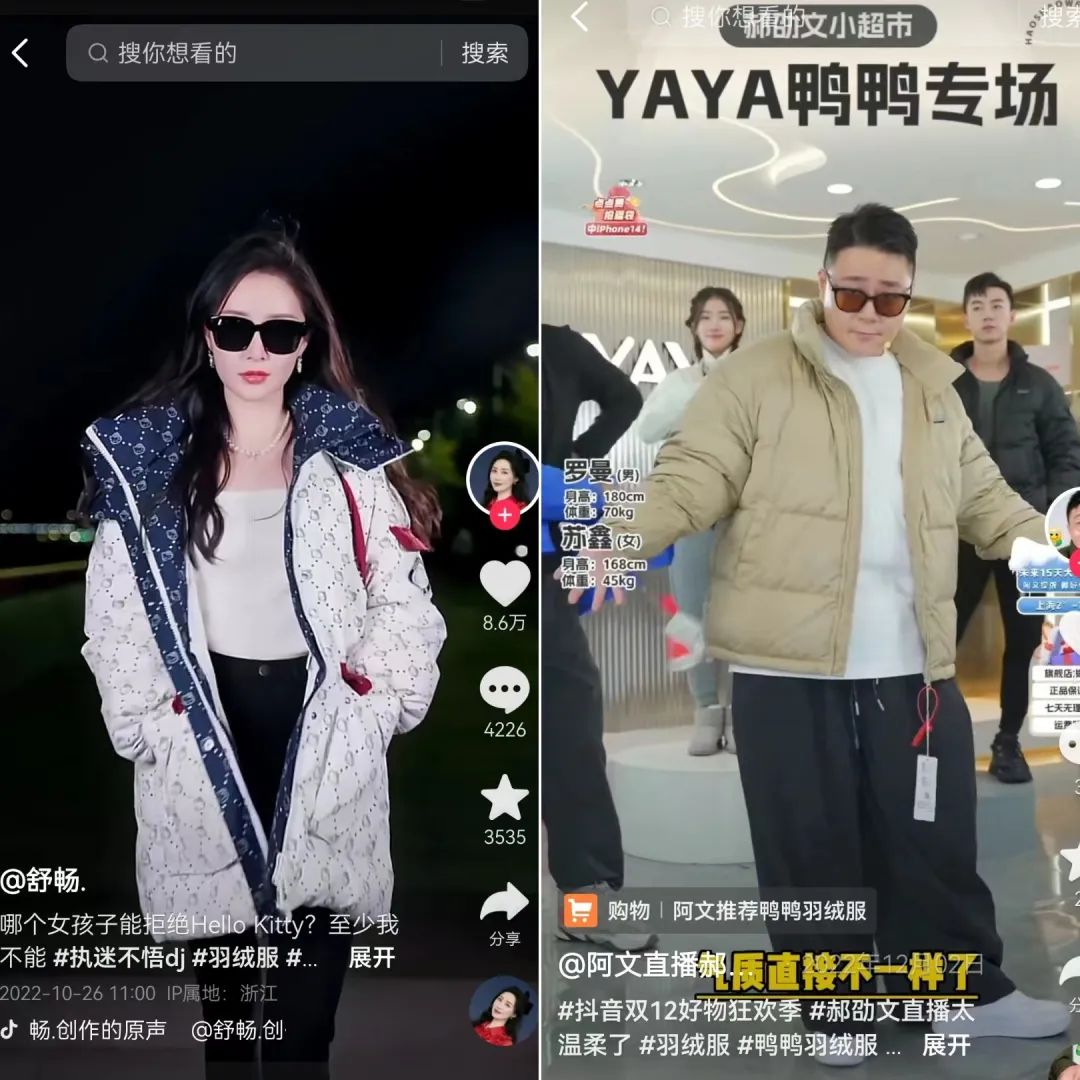从具体路径上看,在判定羽绒服为潜力爆款后,鸭鸭选择了与流量明星赵露思合作,以 “赵露思同款”作为核心卖点,在各内容平台联合达人进行种草加持;11月,鸭鸭将该款羽绒服上架到了抖音,并通过与“抖音超品日”合作,进一步扩开了单品覆盖的人群规模。