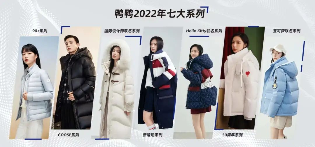 增加千元以上、中高端产品系列。“鸭鸭在千元以下的大众市场里做到了TOP1,去年推出了千元以上的高端GOOSE鹅绒系列后获得了很不错的市场反响。”诗琦表示,“大众消费最具有代表性的价格带的肯定是 399 到 799区间之内,但我们如果想要做国民品牌,还是希望尽可能覆盖到更多人群的需求。”