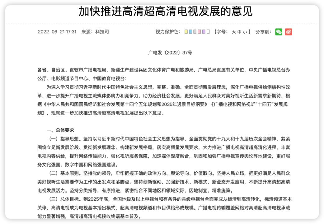 在政策上,2022年6月,总局《关于进一步加快推进高清超高清电视发展的意见》政策出台,提出了发展目标与要求:到2025年,基本实现超高清电视的规模化发展与终端普及。在此之后,各地方广电播出机构便开始积极推进全高清化播出、4K超高清制播能力建设等工作。