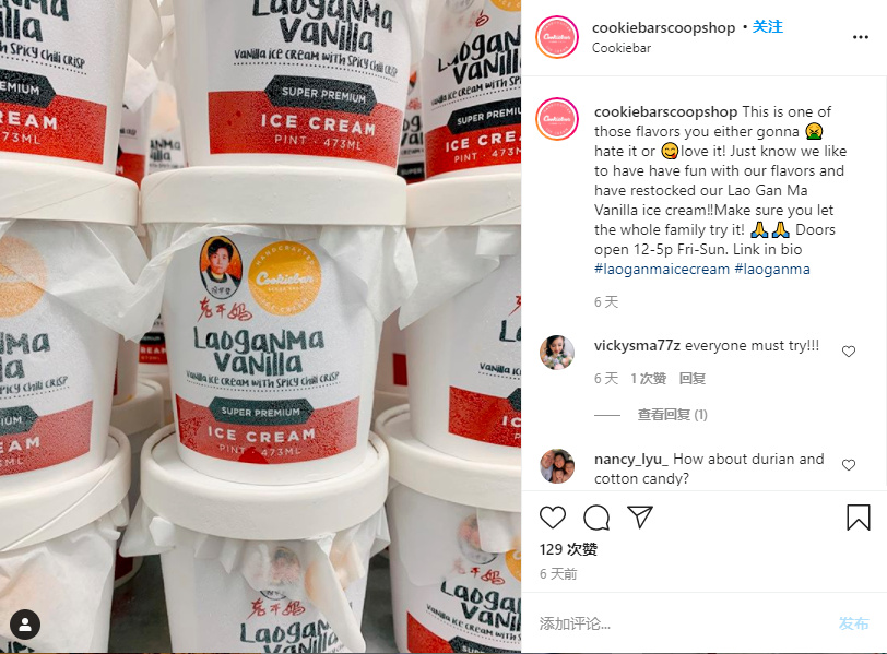 2020年,国外冰淇淋品牌Cookiebar Creamery推出老干妈香草味冰淇淋,并在菜单上如此描述:甜、咸、脆的完美平衡。