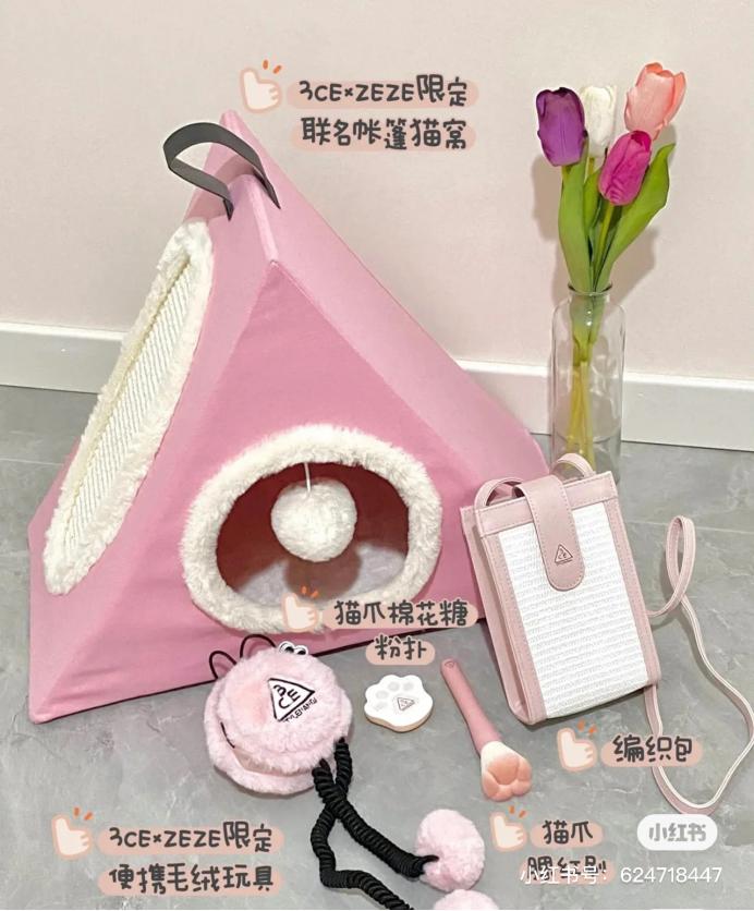 嗅到宠物营销的先机,3CE联合猫窝品牌ZEZE,限定联名推出“公主帐篷猫窝”的赠品,打造春日出游场景,带着猫咪去露营。