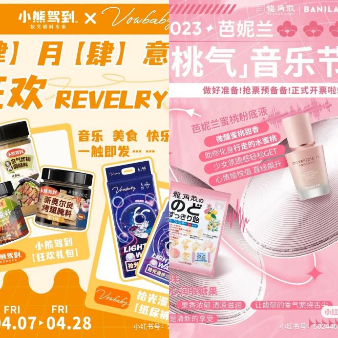 基于音乐节的场景,不少品牌脑洞大开,搞起了跨界联名的福利派送,芭妮兰蜜桃粉底液X龙角散润喉糖果,演出嗨唱时,既能保护嗓子,又能拥有持久妆效;小熊驾到调味料X时光漫步纸尿裤,在户外撒野自由自在……
