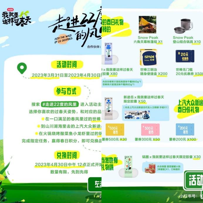 目前,小红书已经联合“锅圈”“上汽大众”“世棒三明治”“Snow Peak”等品牌发起#走进22度的风里#话题,已经有1195.7万浏览量,线上通过薯民预热短片、随机旅行大事件等品牌话题制造炒作春天的向往感,线下通过KOL随机旅行团、春天大巡游、春天大汇演等进行品牌声量扩散和全域转化。