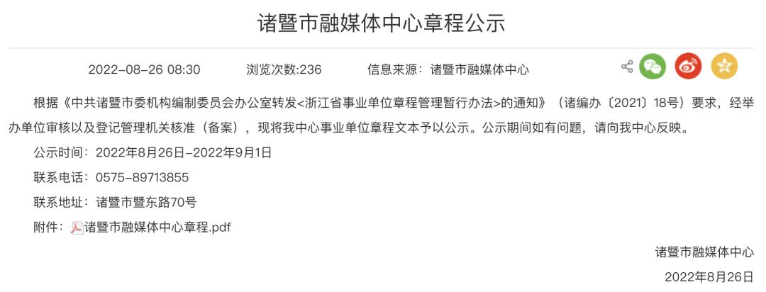 「广电独家」注意到,诸暨市人民政府官网曾于2022年8月公示了《诸暨市融媒体中心章程》。其中提到,诸暨市融媒体中心(以下简称“中心”)是经中共诸暨市委机构编制委员会批准,由中共诸暨市委举办的公益一类事业单位。