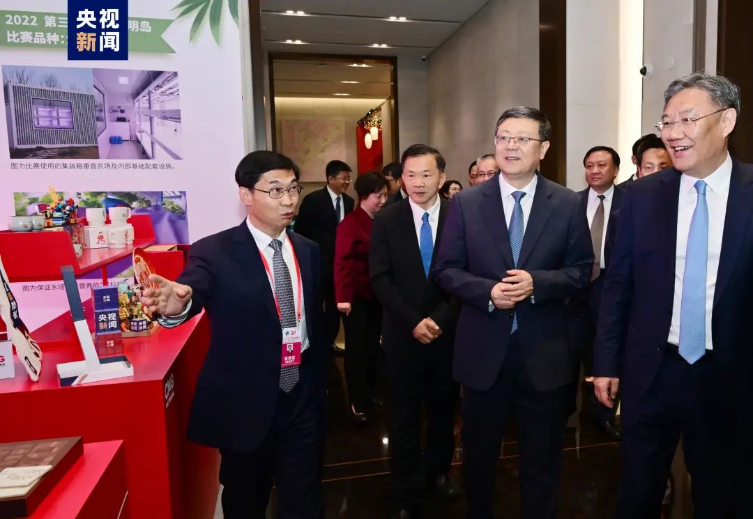 △陈吉宁和王文涛、慎海雄观看中央广播电视总台文创产品展示,并慰问总台财经中心的现场直播带货团队