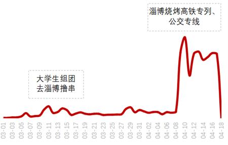 第二阶段,网络流量在4月9日冲顶,一方面,美食博主、自媒体发现淄博烧烤这一流量密码,自发前往当地“打卡”,淄博烧烤量足、店家热情、服务周到等特点受到好评。另一方面,淄博政府及时推出淄博烧烤高铁专列,随后火上热搜,被各家主流媒体报道。