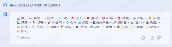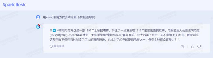 据速途网深度体验显示,目前版本的讯飞星火大模型为单模态人工智能大模型,支持文字信息。但速途网在5月5日选择官方推荐的对话“用emoji表情为我介绍电影《泰坦尼克号》”,星火的回答中出现错码/乱码的情况。