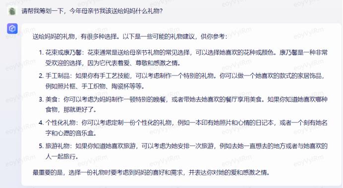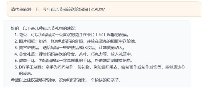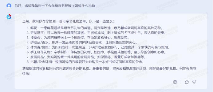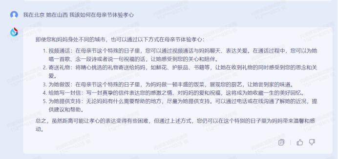 讯飞星火则回复“即使身在不同的城市,也可以通过以下方式在母亲节体验孝心”,这其中值得注意的是第3个方案中,“为她做饭”,显然不在同一个城市无法为妈妈亲手做一顿丰盛的饭菜,AI的逻辑性还有待提升。