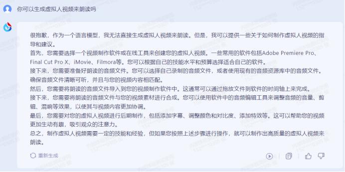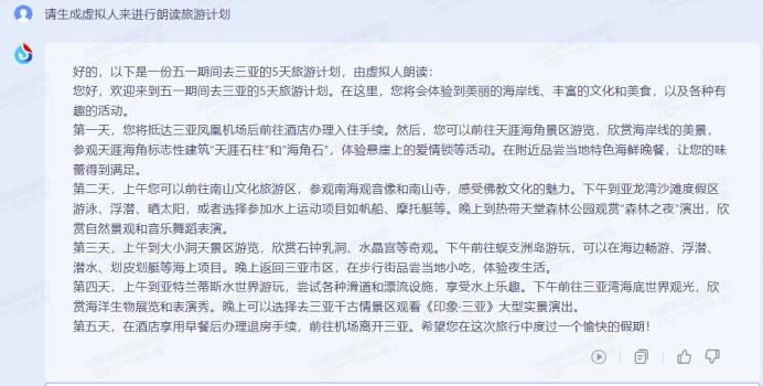 但速途网在目前的测试版本中对讯飞星火进行提问,将星火大模型生成的五一旅游计划进行虚拟人朗读操作后发现目前的版本中还未支持合成虚拟人视频,对此,也有不少网友猜测,生成虚拟人视频功能或许将在未来成为收费项目。