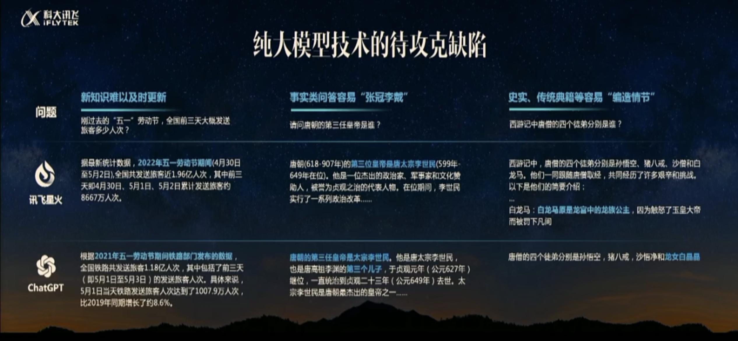 此外,科大讯飞董事长刘庆峰也在发布会现场提出了“纯大模型技术的攻克缺陷”,针对“新知识难以及时更新”、“事实类问答容易张冠李戴”、“史实、传统典籍等容易编造情节”,科大讯飞针对目前存在的问题也提出了解决方案,更是宣布在今年的三个阶段的升级计划: