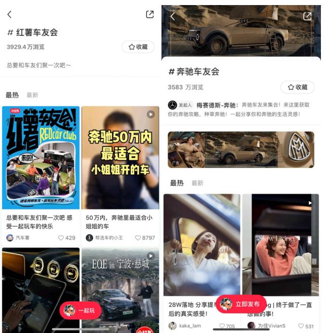 以「奔驰车友会」为例,此次活动最大力度地激活了小红书站内外的奔驰车友和汽车爱好者的热情,让他们自发为品牌站台打call,不仅提升了品牌的传播声量,也进一步实现了涨粉转化,奔驰成为众多有购车意愿的小红薯的dream car。除此之外,活动期间产出的优质奔驰车生活笔记,将沉淀为品牌在小红书社区的无形资产,所搭建的奔驰车友联盟也能为奔驰实现全域种草,安利给更多有购车需求的小红薯。