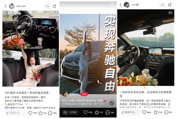 奔驰车友会召集令一经发出,便吸引了众多来自小红书站内外的爱车同盟。他们火速集结,在小红书搭建的活动阵地#奔驰车友会 活动主题页,真诚地分享自己与奔驰爱车的每个精彩瞬间。从提车日记到驾车体验,从购车攻略到装饰经验,丰富的车生活笔记在小红薯们的热情分享与创作中,源源不断地聚集而来,并产出多篇千评、万赞的优质爆文,组成了一个丰富多元、时尚浪漫的车生活阵地。