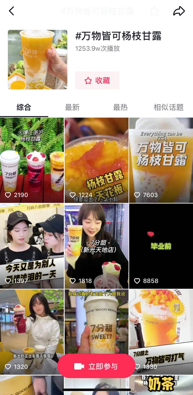 创新吸睛这条路上,7分甜从未停止过探索。从2006年7分甜前身的“谢记甜品”开始,杨枝甘露就是店内的招牌产品。7分甜入驻抖音后,继续在短视频内容中强化这款产品的品牌认知。以#万物皆可杨枝甘露# 玩法,将杨枝甘露经典饮品与小笼包式麻薯搭配,推出具有上海地域特色的“上海小笼包杨枝甘露”新品,与Oatly联名上新“燕麦奶杨枝甘露”,特别策划适合宝宝饮用的“mini杨枝甘露”单品,联名光明推出“杨枝甘露雪糕”等,通过限量版多样化杨枝甘露产品创新,让“杨枝甘露就喝7分甜”的品牌认知在不同阶段出现,持续在抖音强化“好玩产品”的心智,品牌差异化也更加明显。在这个流量与内容并重的时代,抖音生活服务既能提供巨量的曝光,提升用户对7分甜的认知频次,又能以原生用户力助推7分甜“差异化”内容的裂变传播。深耕平台玩法的7分甜,不断推出新品和平台绑定的吸睛内容,戳中平台传播痒点,撬动UGC内容的自发传播,而借助POI+内容挂售,平台链路可进一步激发消费者,在发现兴趣内容的同时,实现随心的消费闭环。