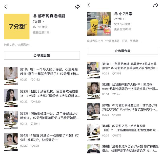 除了爆品打造的内容更新,7分甜还通过官方矩阵的日常更新,在垂类粉丝群体中持续输出产品相关内容。官方短视频内容方向分为以产品上新为主的“月月上新”,聚焦品牌爆款打造的”万物皆可杨枝甘露“,洞察青年白领生活的“都市纯真连续剧”,门店趣事相关合集的“小7日常”,内容不仅涵盖新品特点展示、还深挖职场加班、下午茶事件等跟新茶饮相关场景,围绕着7分甜产品的“花式吃法”等内容方向,聚焦“好喝好看好玩”,将7分甜进行内容植入。