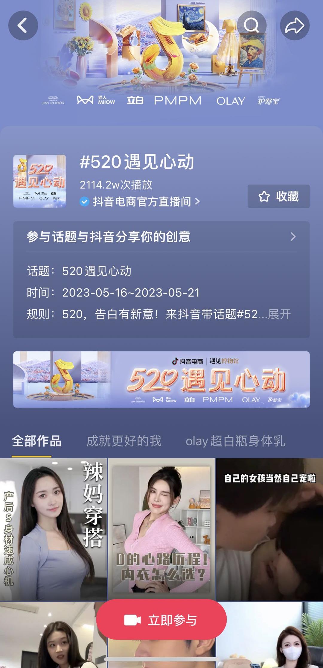 为让更多用户发现、种草好物,为消费者提供心动好礼之选,抖音电商携手法国让缇丝JEAN D'ESTREES、猫人MIIOW、立白、PMPM、OLAY、护舒宝、水井坊·第一坊、Ulike、曼秀雷敦、肌肤未来、优时颜、羽素YOU&PURE、AMIRO觅光、OLAY身体护理品牌合作伙伴,联合打造品牌专属会场,更有抖音电商X遇见博物馆联名款“520挚爱礼盒”,契合用户多场景礼赠需求,打造礼盒种草热潮,让好礼送到所爱之人心坎里。