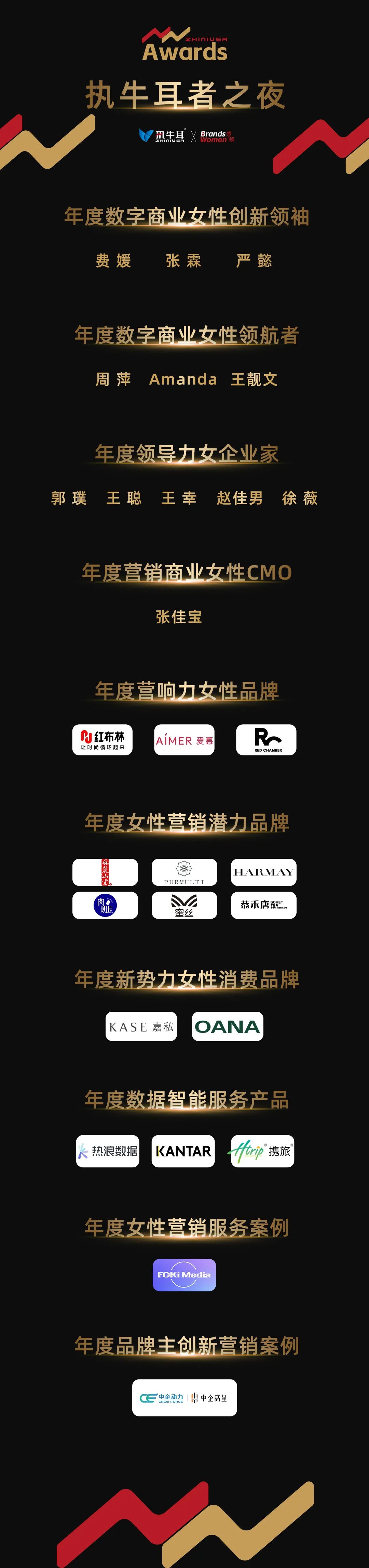 在活动模块设置上,峰会及展览之外,深耕数字营销商业8年之久的「执牛耳」,仍希望为全球营销商业领域的女性实践者和女性消费品牌发声,为「她们」打造璀璨舞台并绘就彩色画像,于是乎「执牛耳」开启了“女性营销执牛耳者”评选活动——WM.ZHINIUER Awards(简称“WMZA”)。作为业界首个专属于商业领域女性消费品牌&女性营销人的年度评选活动,主办方于今年对奖项进行了科学细分与整合,并邀请50余位来自全球知名品牌及服务商的杰出女性营销人担当WMZA 评审,力图通过「执牛耳」这个超级符号,推动整个赛事、营销商业生态、女性消费品牌、服务商及女性营销人的“共同生长”。“执牛耳者之夜”揭晓了“WMZA 2023”名单。
