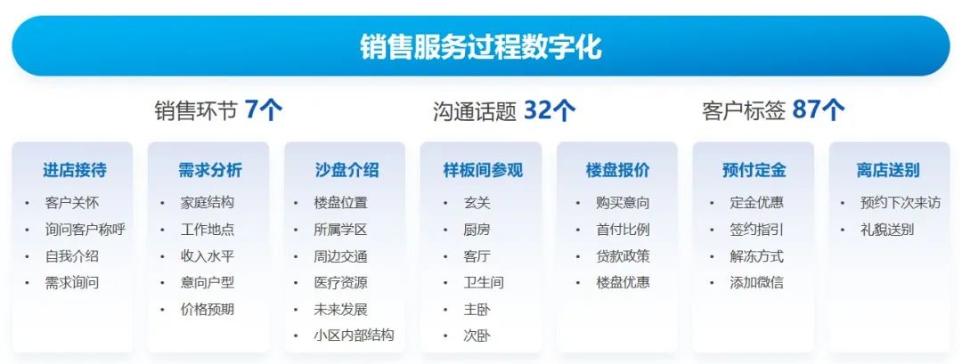 员工挖需过程管理:房产置业顾问挖需维度多元,能否在短时间内获取到访客的关键信息,例如访客想买多大的房子、周边配套要求如何、预算多少、家庭情况是否需要学区、是否有老人需要医院等,对需求的把握程度会直接影响后续成交。
