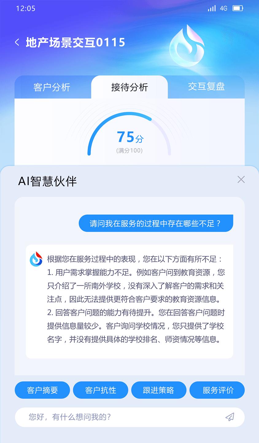 讯飞iCase会话智能系统2.0通过对置业顾问线下交互对话的智能挖掘,精准找出置业顾问的接待薄弱项,提升接待技能和员工开口率,使得目前该房产项目置业顾问开口率提升23%。