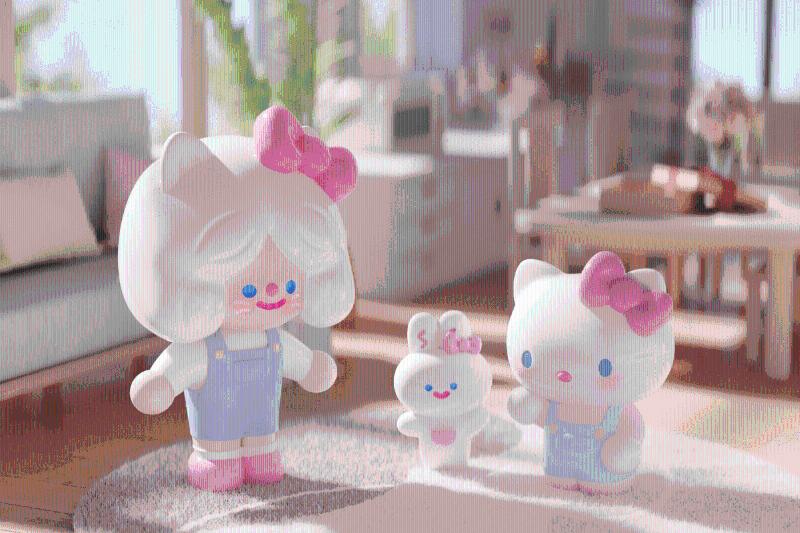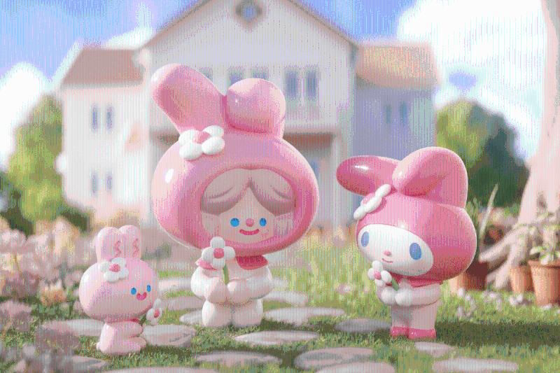 值得注意的是,艺术家从三丽鸥家族的经典IP故事及形象中提取了美乐蒂头戴的鲜花、库洛米争夺的音符、凯蒂猫耳朵上的蝴蝶结等符号元素,运用在联名大娃的设计中,RiCO和朋友们同三丽鸥家族远道而来的小伙伴们一起,戴上鲜花、蝴蝶结,乘着音符,一个浪漫又日常的联动童话世界呈现在玩家眼前。