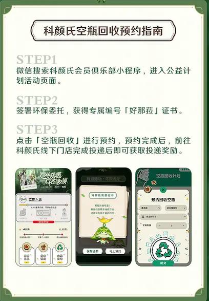 各位旅行者可通过Kiehl's科颜氏线上会员俱乐部小程序预约空瓶投递,预约后可获得「好那菈」环保电子荣誉证书,随后前往线下快闪店设置的公益回收区域投递任意护肤品牌的塑料材质正装空瓶后,即可获得100品牌会员积分、「巡林奇遇联动贴纸包」1份及「雨林来信联动明信片」1张,同时获得明信片后可额外加盖「好那菈」专属盖章;同样旅行者们在联动期间也可预约至全国线下门店参与“空瓶回收计划”,成功投递1个任意护肤品牌的塑料材质正装空瓶后即可获得100品牌会员积分。